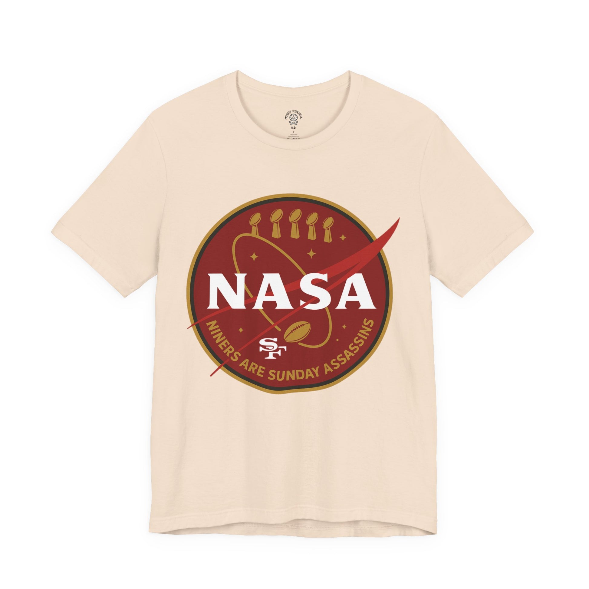 Blast off on game day with this red-and-gold NASA-inspired tee, repping the “Niners Are Sunday Assassins” motto loud and proud. Featuring football trophies, a bold space emblem, and colors true fans know by heart, this shirt’s ready for tailgates, touchdowns, and takeoffs.